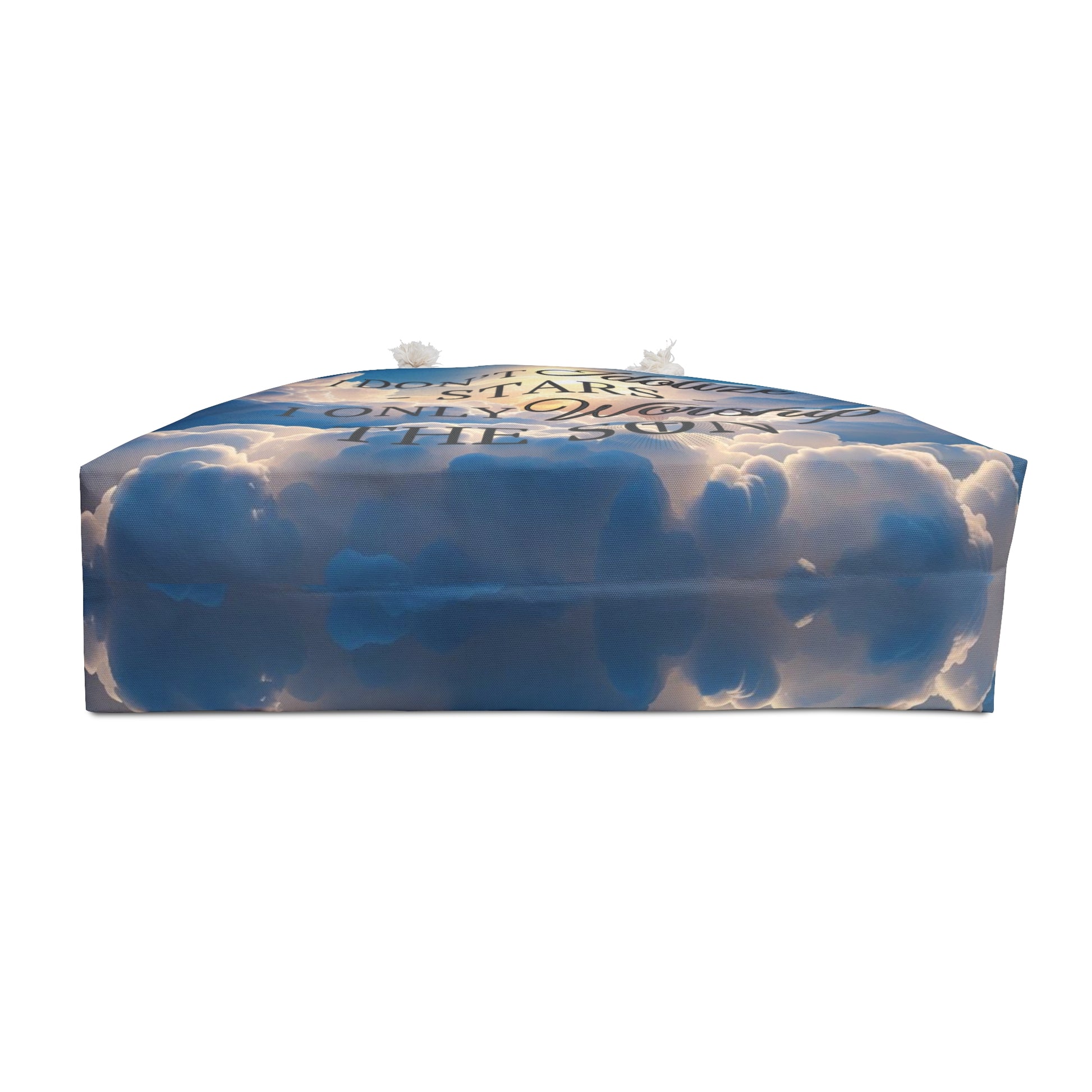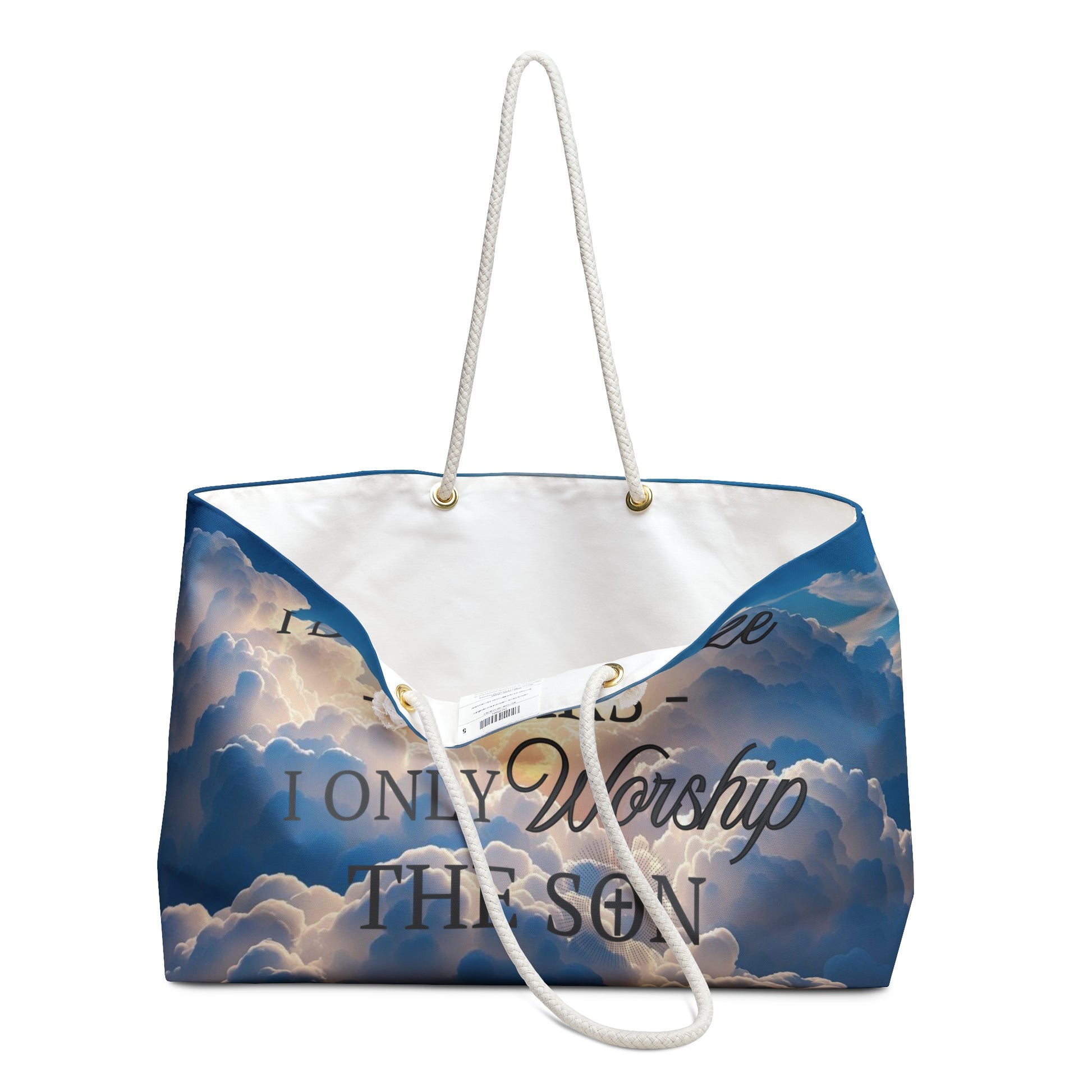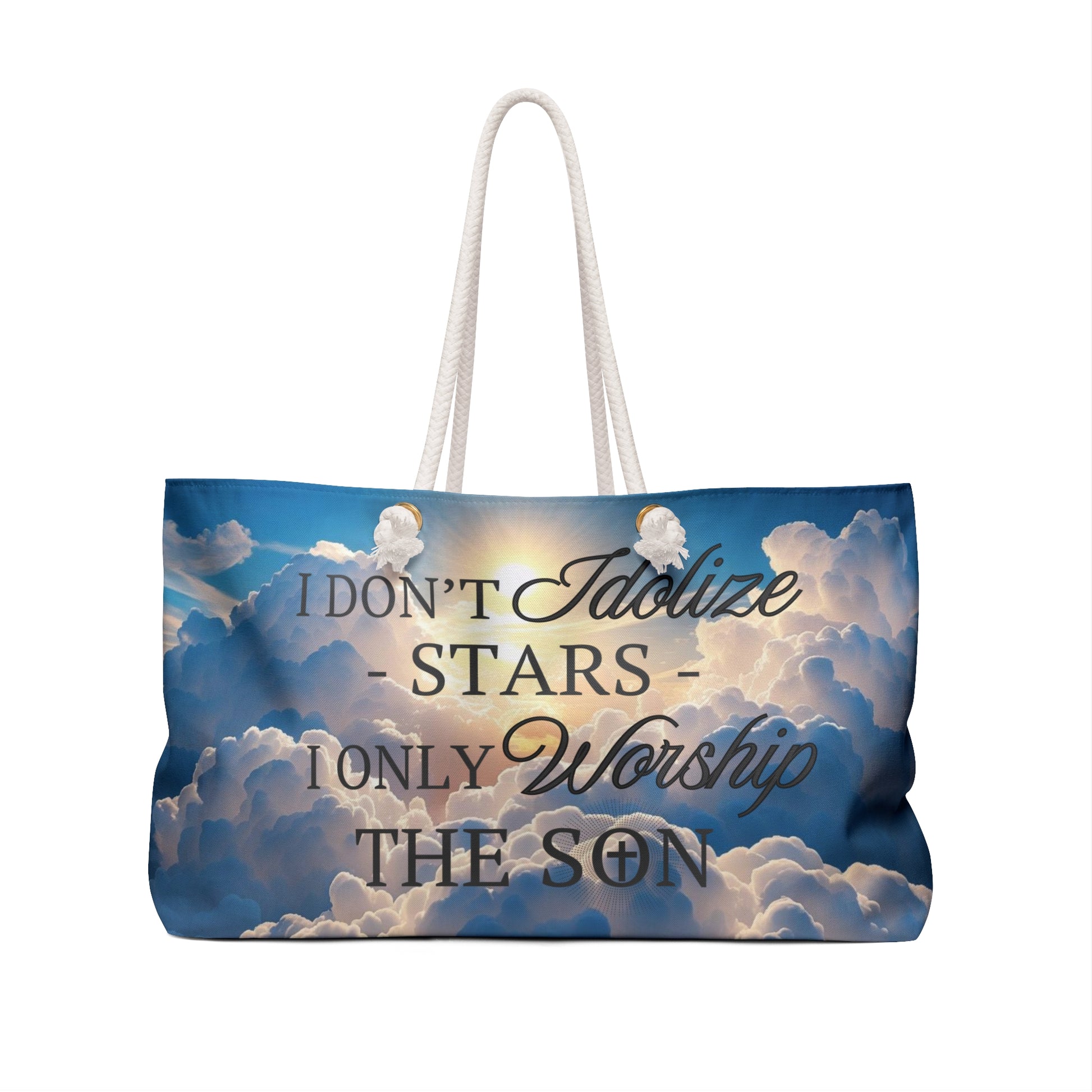Carry your faith with you on every journey. This spacious weekender bag features the uplifting message “I don’t idolize stars, I only worship the Son” printed front and center—perfect for travel, church retreats, or weekend getaways. Made from sturdy, high-quality fabric with comfortable shoulder straps, it keeps your essentials organized while letting your light shine. A beautiful reminder to put Christ first, no matter where life takes you.